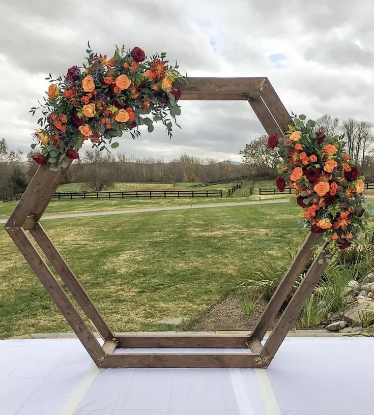 This wood hexagon arch is a breathtaking, modern yet rustic feature perfect for a wedding ceremony. Its sleek, six-sided geometric frame is crafted from premium wood, offering a warm, natural aesthetic that complements any wedding theme. This versatile arch serves as an ideal canvas for florals, providing an elegant backdrop for lush blooms, greenery, or even cascading florals that add romance and vibrancy to the space. Whether adorned with soft pastel roses, bright wildflowers, or timeless white florals, the wood hexagon arch elevates the overall atmosphere of the wedding, creating a stunning focal point for vows, photos, and memories. Arch Rental, Flowers not included.