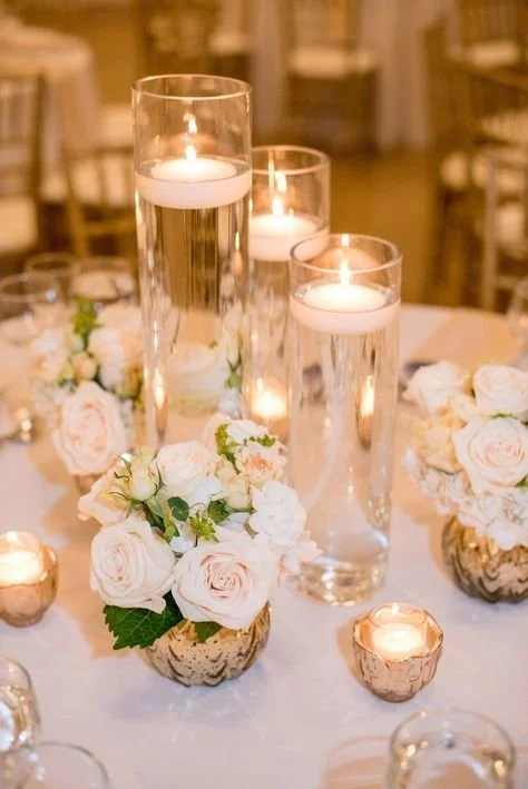 Floating candles are an enchanting and elegant choice for wedding centerpieces, adding a soft, romantic glow to any reception table. Nestled in elegant glass vases, different glass vase styles available, these candles create a tranquil ambiance as they float gracefully atop water, casting a warm, flickering light. Perfect for creating a serene atmosphere, floating candles can be paired with flower petals, crystals, or greenery to enhance their beauty. Whether used in a minimalist design or as part of a lavish display, these candles add a touch of sophistication and magic, making them an ideal addition to your wedding décor.